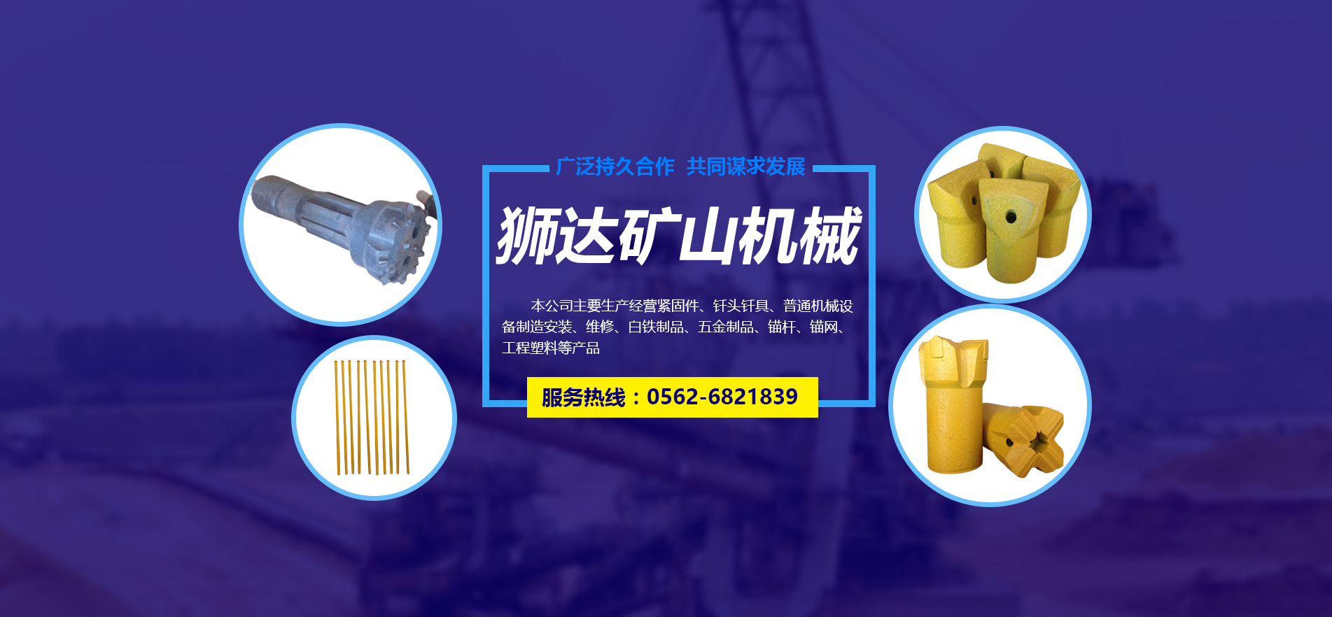 主營緊固件、釬頭釬具、普通機械設備制造安裝、維修、白鐵制品、五金制品、錨桿、錨網、工程塑料等